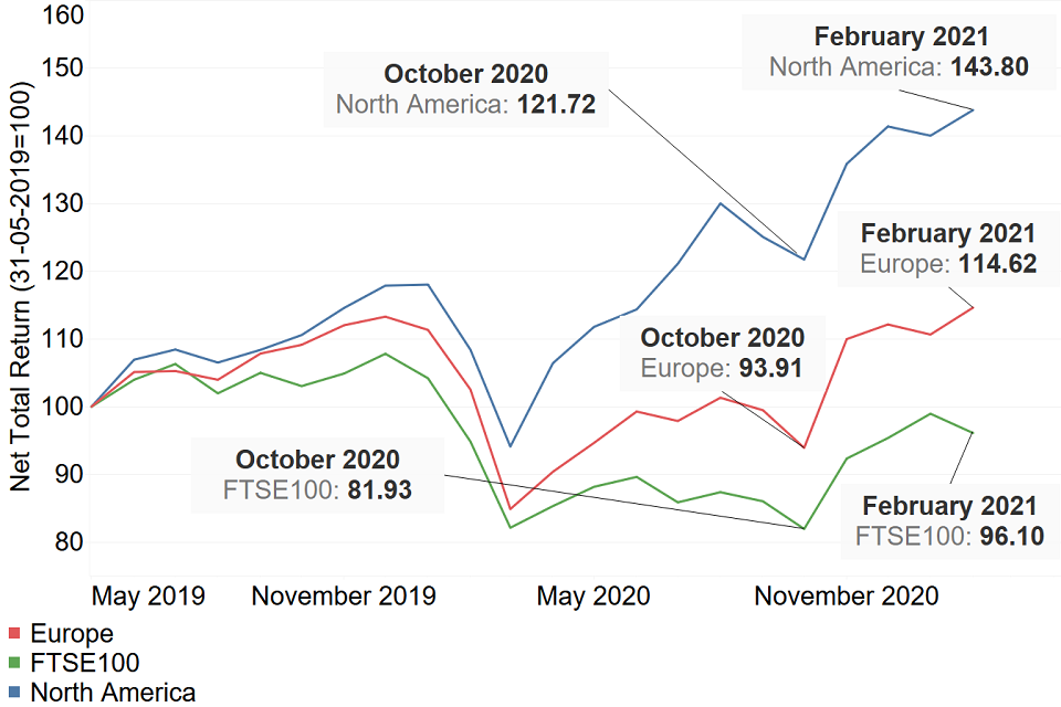 The FTSE 100 has dropped in February 2021 after previously increasing for 2 successive months, compared to increases in the European and North American markets over the February period. This could be a small correction following the previous 2 months’ increases and the continuing effects of the national lockdown in the UK.