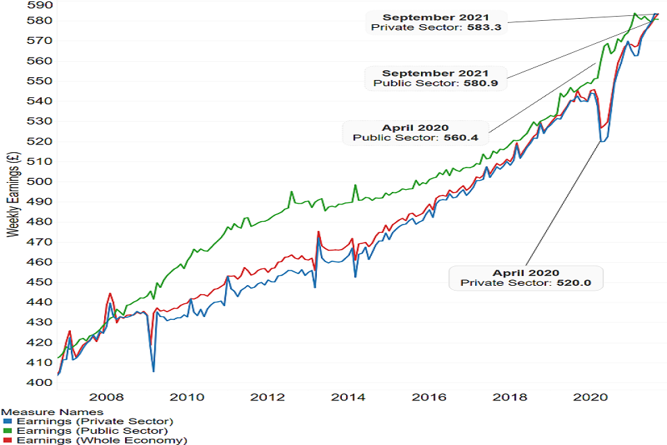 The private sector overtook the public sector for the first time since February 2008. This could be attributed to the public sector pay freeze which came into force in April 2021. However, the Autumn Budget and Spending Review 2021 committed to ending the pay freeze in April 2022 which should increase public sector average weekly earnings.
