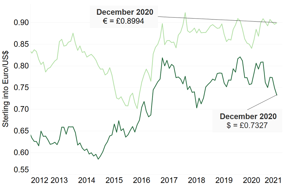 We focus on the exchange rate between the British Pound and both the Euro and the US Dollar. The chart below shows how these rates have varied between January 2012 and December 2020.