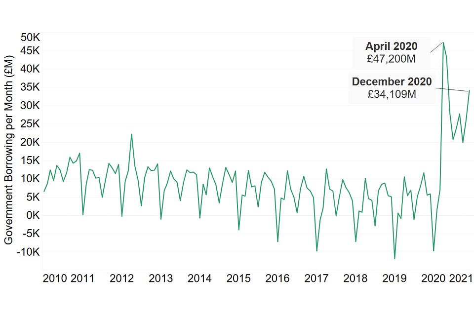 Public sector borrowing for December 2020 was £34.1 billion. This continued the increasing levels of borrowing observed in October and November 2020, which were £19.9 billion and £26.1 billion respectively.