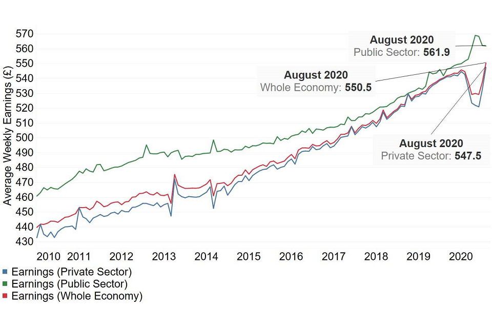 The chart below shows how the average weekly earnings has grown between 2010 and 2020 for the whole economy, as well as the public and private sectors.