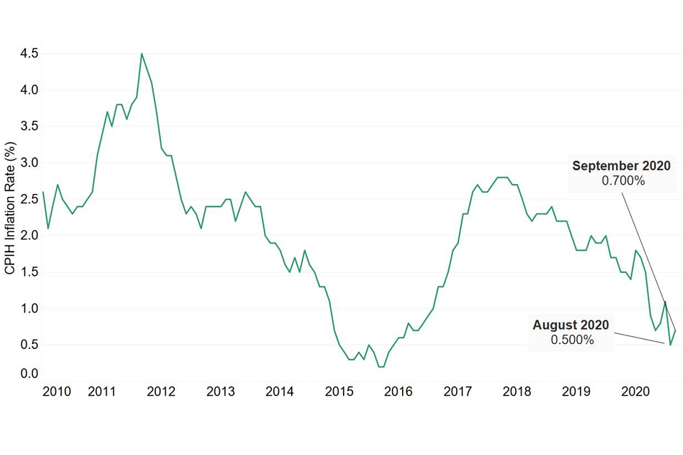 There was a small increase in the CPIH inflation rate to 0.7% in September 2020, up from 0.5% in August 2020.