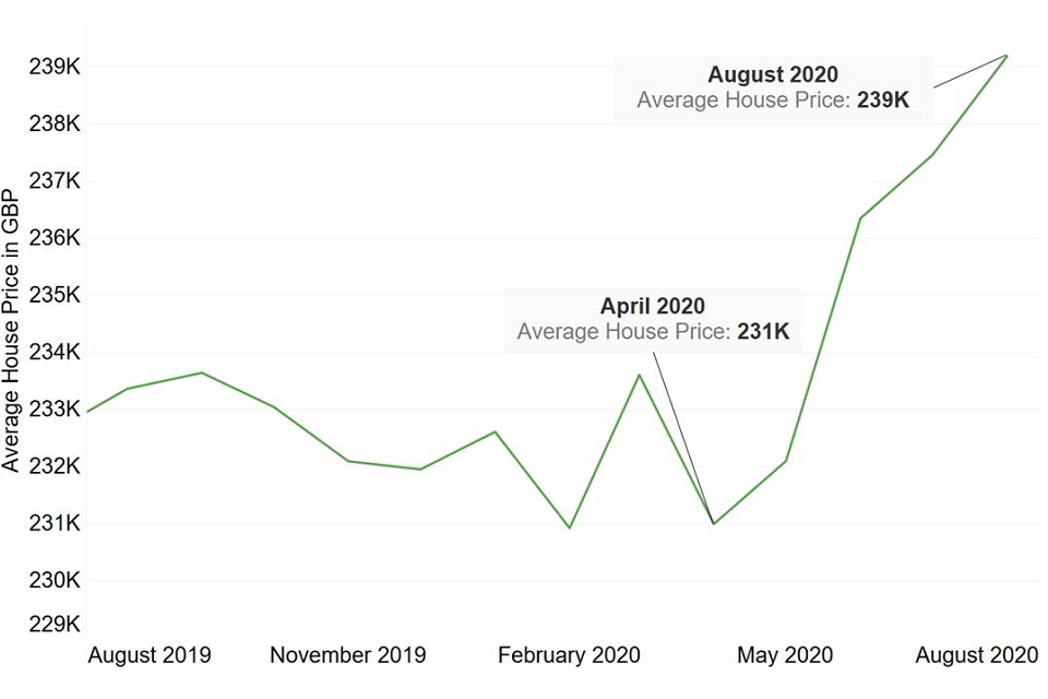 Average UK house prices remained relatively stable between August 2019 (£233,000) and April 2020 (£231,000). Since the relaxation of COVID-19 restrictions, and the stamp duty holiday, there has been an increased demand in the UK housing market which has seen house prices rise sharply over recent months.
