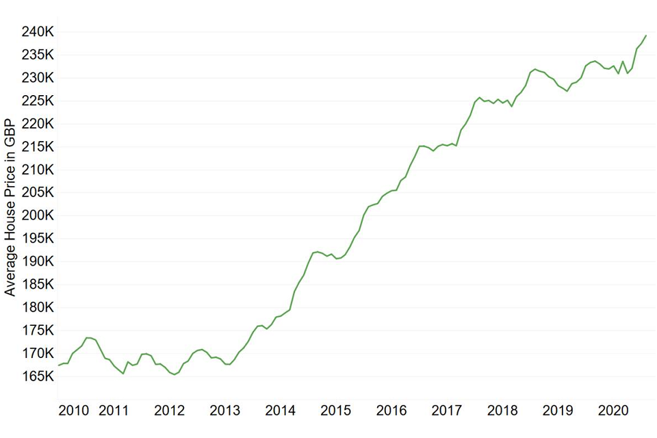 The chart below shows the average UK house price between 2010 and 2020. This was largely stable over the first few years (2010-2013), but has grown significantly over the last 7 years, achieving a growth of almost 50%.