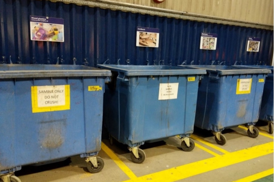 In the image, several samples are stored separately in bins that are appropriately labelled and stored in marked bays. Each bay is demarcated and identifiable using an image above the bay, by the specific waste stream type contained within the sample. For example, the bin containing mixed plastics is stored below an area labelled with an image of mixed plastics.