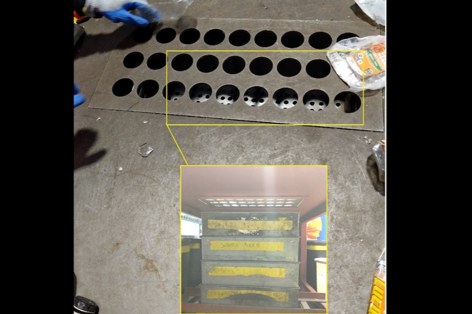 - a caged area contains the sample bin and a bin hoisting mechanism to lift the bin over the adjacent sorting table