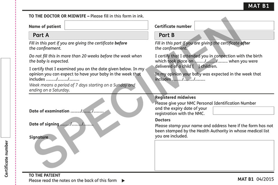 The MAT B1 may be issued by a doctor or registered midwife who attended the patient in connection with her confinement.