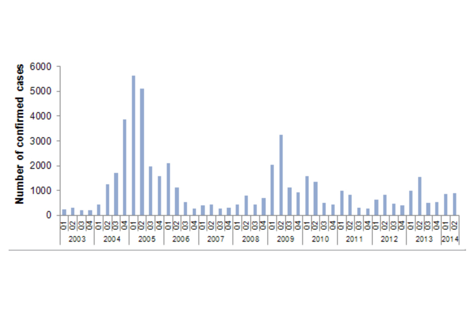 Laboratory confirmed cases of mumps by quarter, England, 2003 to 2014