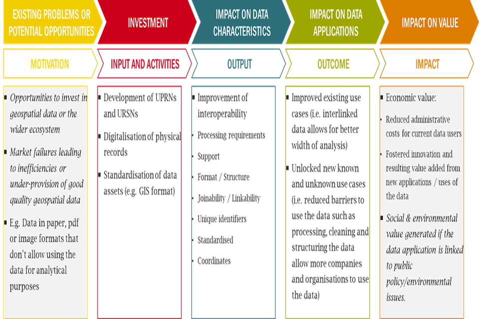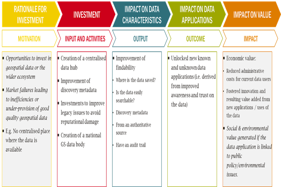 An example theory of change for an investment in geospatial data reusability.This covers 5 stages (1) Existing problems or potential opportunities (2) Investment (3 )Impact on data characteristics (4) Impact on use cases (5) Impact on value