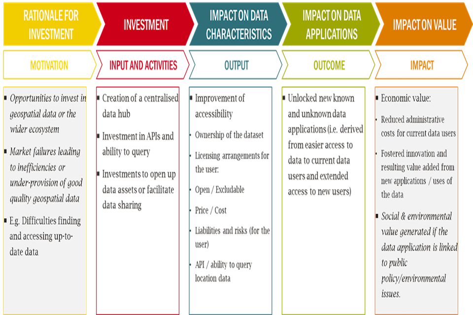 An example theory of change for an investment in geospatial data accessibility.This covers 5 stages (1) Existing problems or potential opportunities (2) Investment (3 )Impact on data characteristics (4) Impact on use cases (5) Impact on value