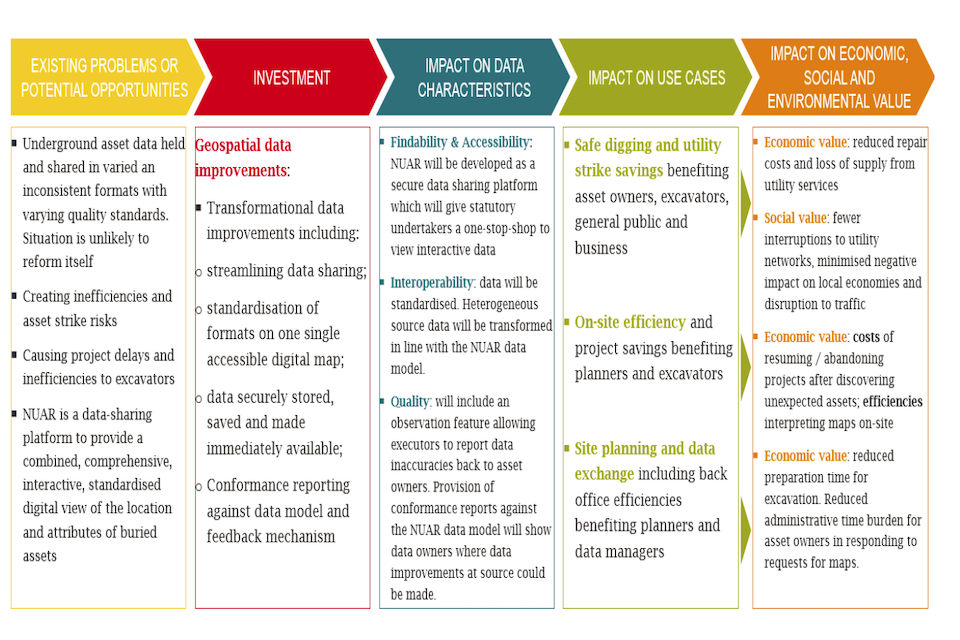 This figure sets out a specific theory of change for NUAR. This covers 5 stages (1) Existing problems or potential opportunities (2) Investment (3 )Impact on data characteristics (4) Impact on use cases (5) Impact on value