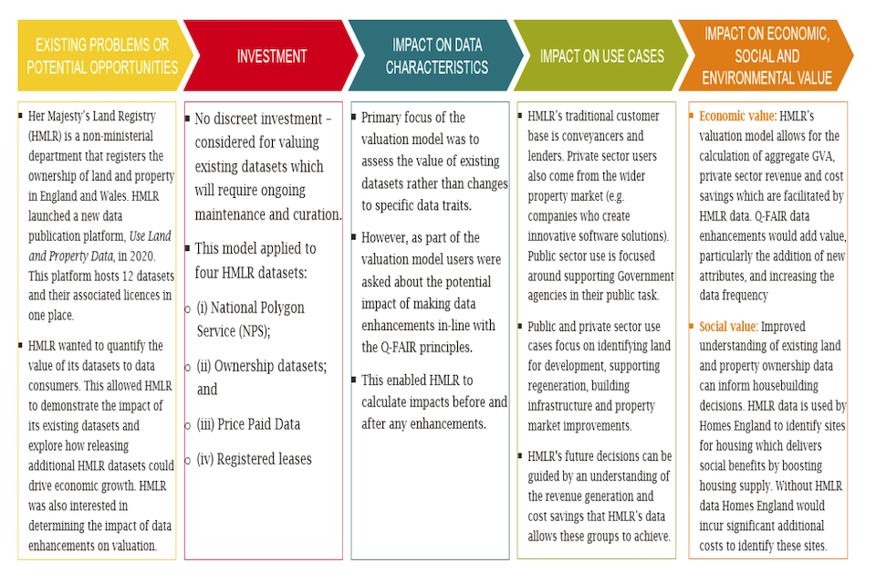 HM Land Registry (HMLR) data valuation: HMLR wanted to quantify and evidence the value of its datasets to direct data consumers. This was motivated by an interest in demonstrating the impact of existing datasets and potentially exploring how releasing additional HMLR datasets could drive future economic growth. This model has been applied to four HMLR datasets.