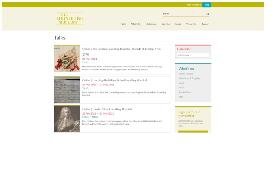 - The Foundling Museum in Greater London presented a series of talks delivered by video around the history and notable persons of the site.