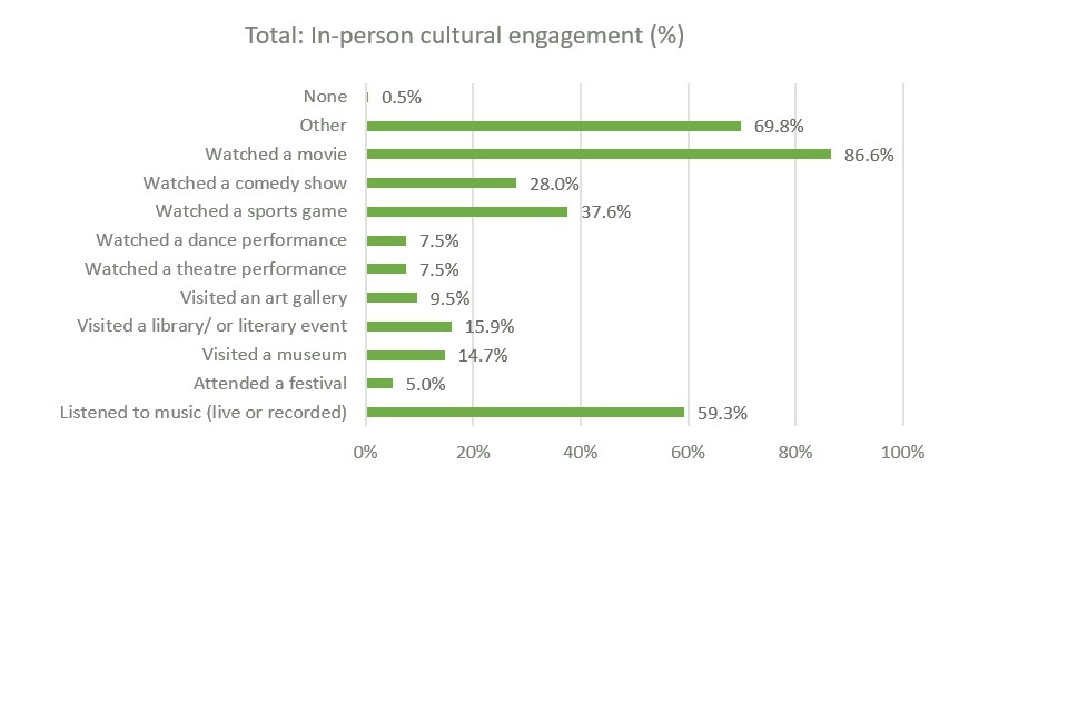The DCMS Taking Part survey is a UK-wide survey that samples a panel that is representative of the UK population. This wave was collected in 2019 -early 2020. which covers a range of topics (e.g., work, retirement, home and family life). Headline measures of engagement taken from the DCMS Taking Part Survey for the year April 2019 to March 2020 ↩