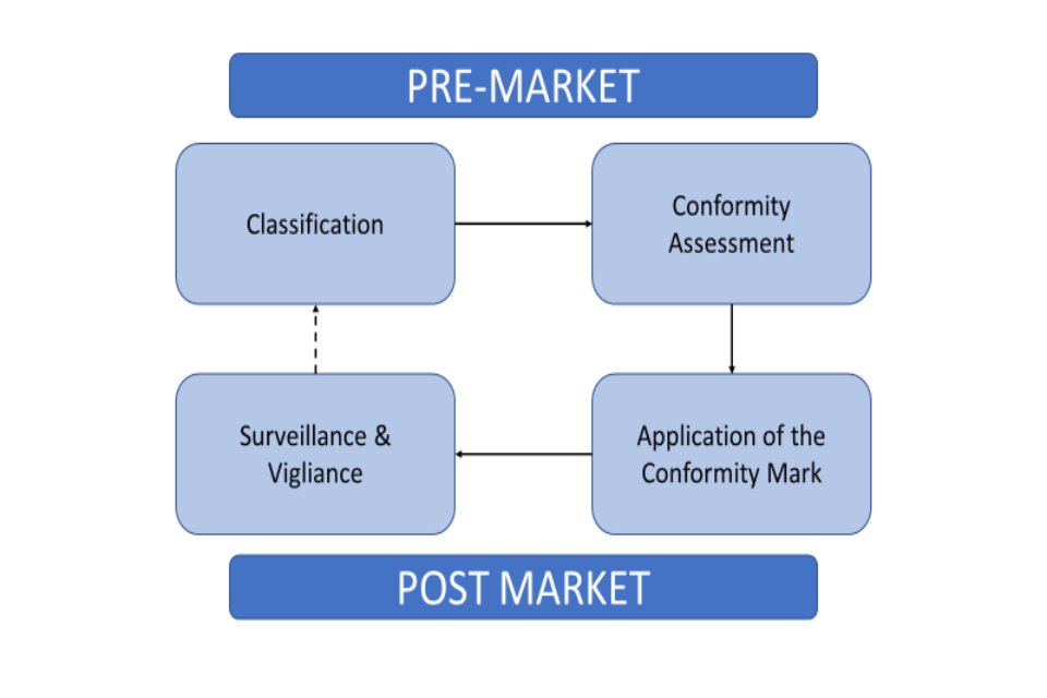 Figure 1 shows the regulatory cycle of a medical device. The pre-market assessment consists of classification of the device and then a conformity assessment. This then leads to post-market where application of the conformity mark takes place and then leads to surveillance and vigilance of the medical device.