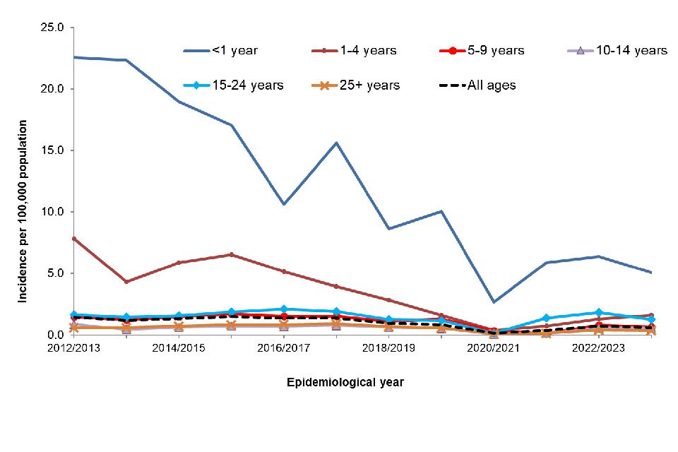 Note: When most cases of a disease arise in the winter months, as for IMD, epidemiological year is the most consistent way to present the data as the peak incidence may be reached before or after the year end. Using epidemiological year avoids the situations where a calendar year does not include the seasonal peak or where 2 seasonal peaks are captured in a single calendar year.