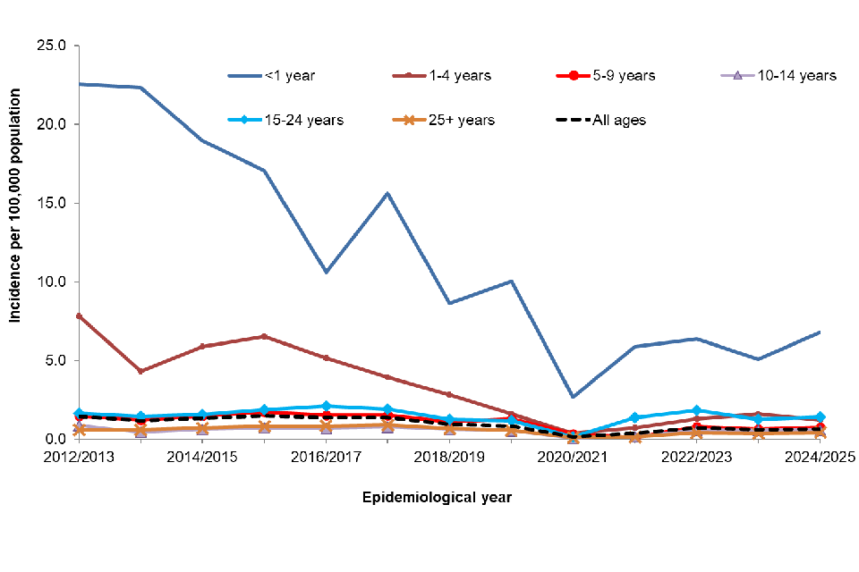 Figure 2. Incidence of invasive meningococcal disease in England: 2012/13 to 2024/25