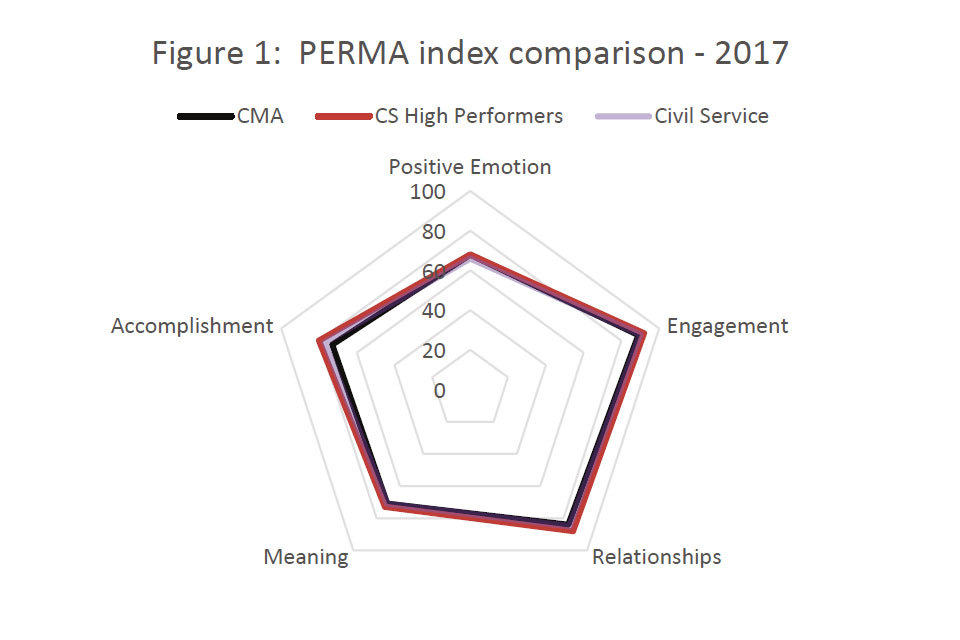 - positive wellbeing, tracking the extent to which employees are ‘flourishing’ in the work place – this uses the PERMA index, which uses People Survey results to measures five dimensions of positive wellbeing: Positive Emotion, Engagement, Relationships, Meaning and Accomplishment