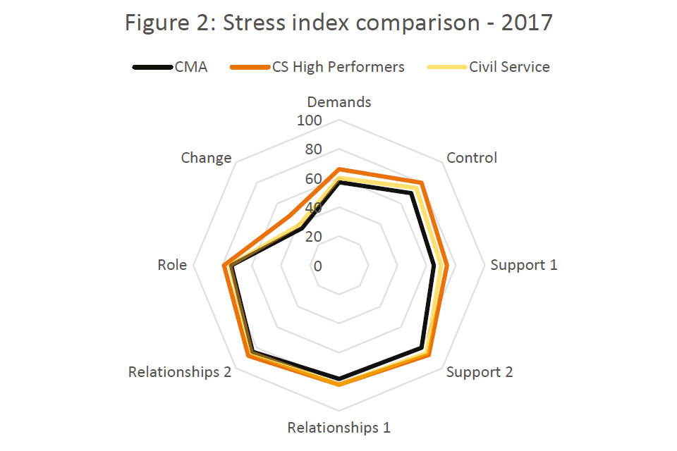 Figure 2 below shows the CMA’s performance against a stress index, relative to the civil service average and high performing units. As with the PERMA index, this chart is represented in positive terms – for example, a higher index score represents a less stressful environment.