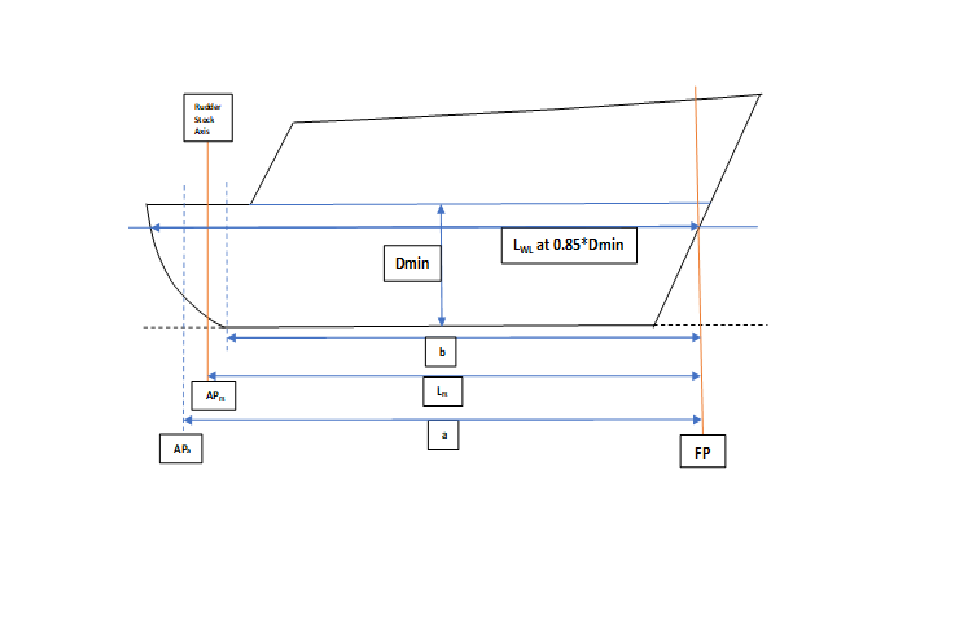 Dimension “a” represents a possible position of the AP (APa) if 96% of the length on the load waterline at 85% of the least moulded depth, Dmin, is greater than the length from the fore side of the stem to the axis of the rudder stock (Lrs).