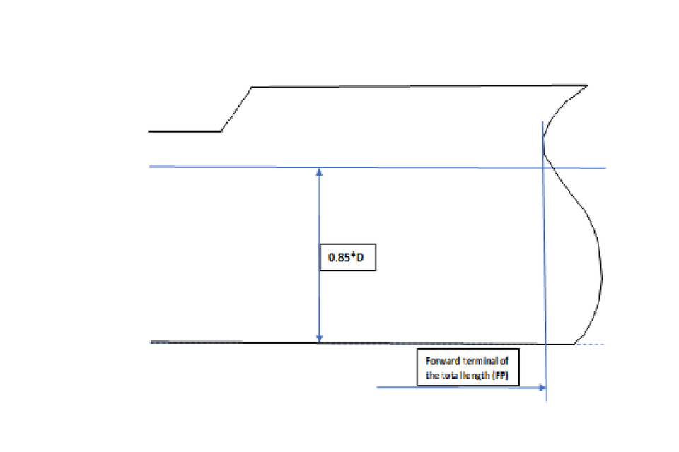 (c) Where the stem contour is concave above the waterline at 85% of the least moulded depth, both the forward terminal of the total length and the foreside of the stem respectively shall be taken at the vertical projection to that waterline of the aftermost point of the stem contour (above that waterline) (see Figure 2).