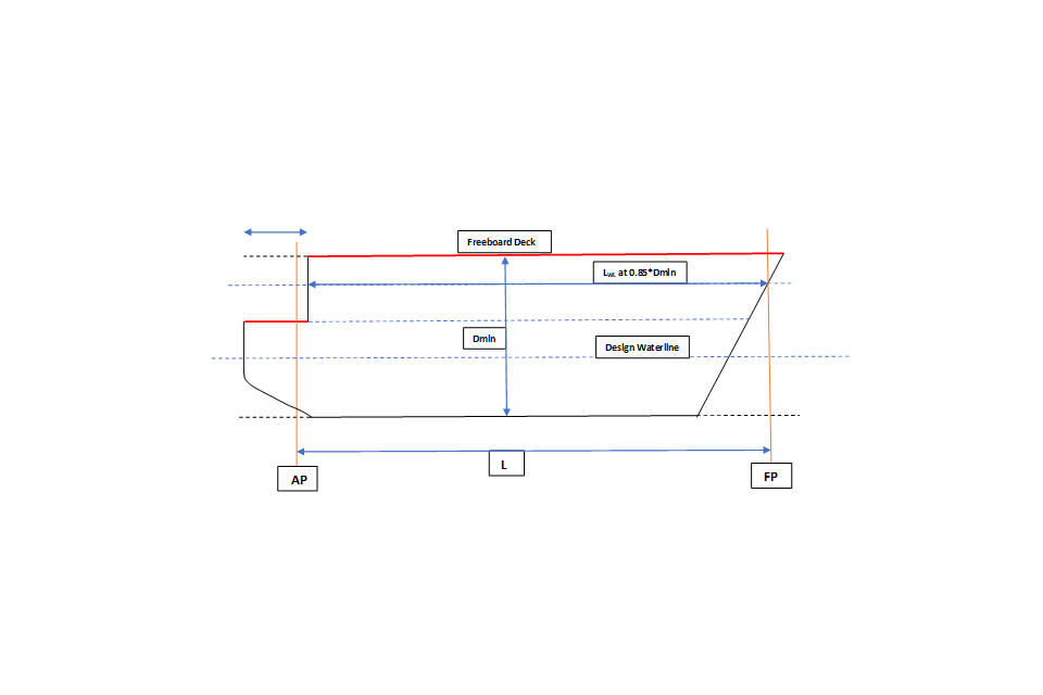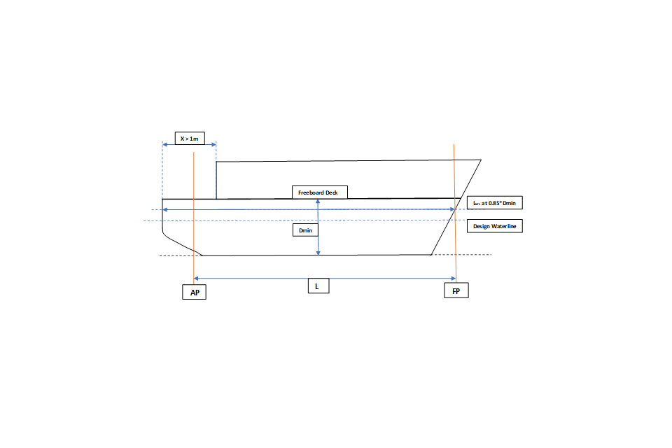 - (a) Step Length > 1 metre: Here the length of the full width step (x) is greater than 1 metre meaning that, according to section 3.3 (c) (i), above, the lowest line of the exposed deck aft and the continuation of that line parallel to the upper part of the deck is to be taken as the freeboard deck. Dmin is the least moulded depth from the top of keel to the freeboard deck, enabling the length on the waterline at 0.85D (LWL) to be measured. Length L is then either 0.96LWL at 0.85Dmin from the fore side of the stem (FP) or the distance from the FP to the axis of the rudder stock, whichever is greater. If there is no rudder stock, the AP is taken to be 0.96LWL at 0.85*Dmin metres aft of the FP