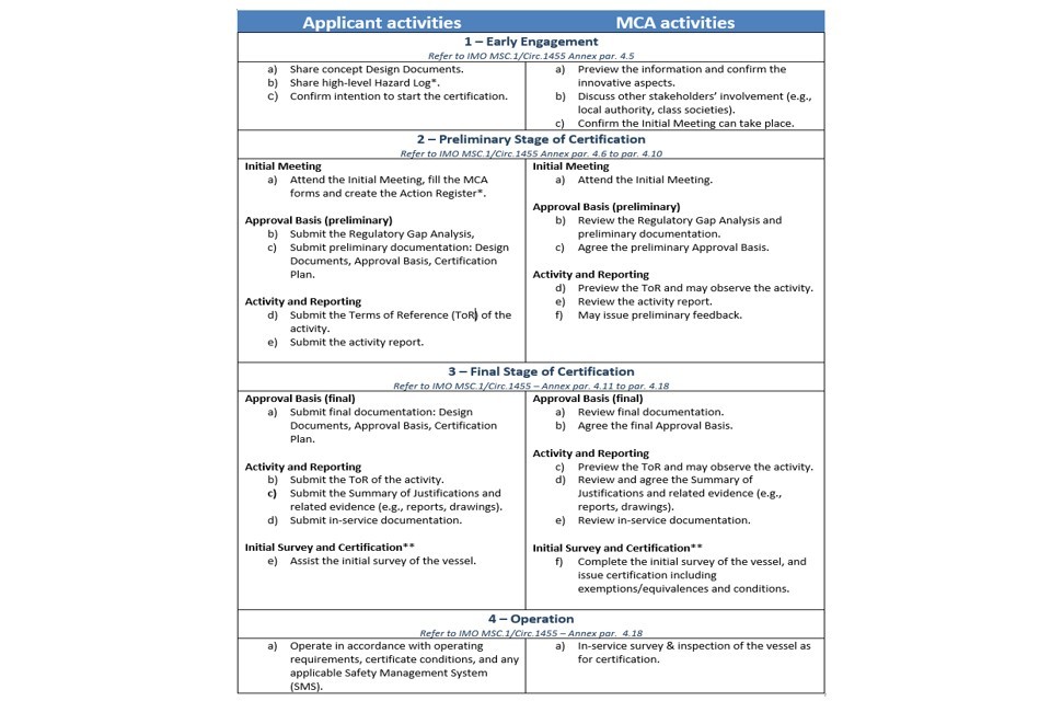 1.3 Although this guidance is intended to be generally applicable to the certification of vessels using Innovative Technology, some of the steps and documental requirements may be not relevant due to the specific technology or low risk profile of the operation. Therefore, the details of the certification process and related documentation should be confirmed with the MCA at the beginning of the application.