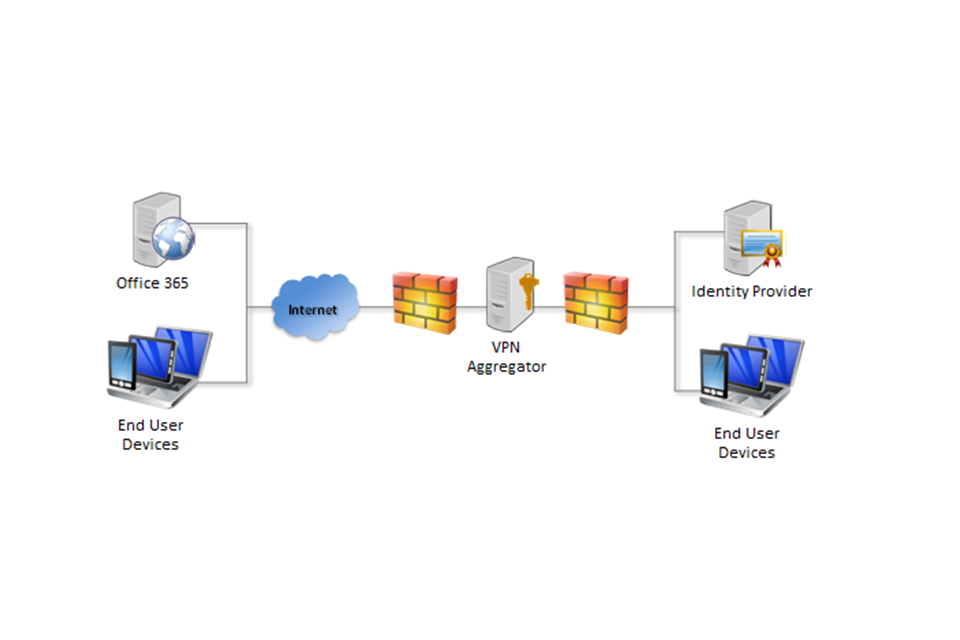 Architecture diagram showing End User Devices authenticating to Office 365 against an on-prem Identity Provider that is behind a VPN Aggregator