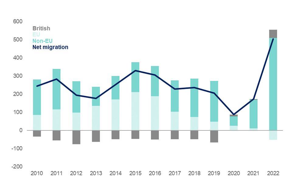 Net migration in the 12 months to June 2022 reached 504,000, an increase of 331,000 compared to the previous year. A significant part of the rise was due to recently introduced visa routes such as those for Ukraine and Hong Kong citizens. In the short term, new visa routes lead to a sharp rise in net migration (since new people enter under these routes and few leave) but this will likely taper quickly as new visa issuance falls and some on the routes return to their country of origin. There has also been a significant rise in the number of international students coming to the UK. Since the vast majority will leave the UK after their studies are ended, most of the rise in net migration is likely to be temporary. The MAC has also previously highlighted the very substantial benefits that international students bring to the UK. In addition, the work routes have been deliberately designed to be flexible in terms of numbers depending on the state of the economy. When the labour market is tight, as it has been in recent months, we would expect employers to be recruiting more from overseas to address shortages. If, as predicted, the labour market weakens in coming months, we would expect a reduction in worker visa applications. We would caution the Government in becoming too focused on particular net migration numbers, and any change in objective would need to be consistent with the fiscal rules that the Government have in place.