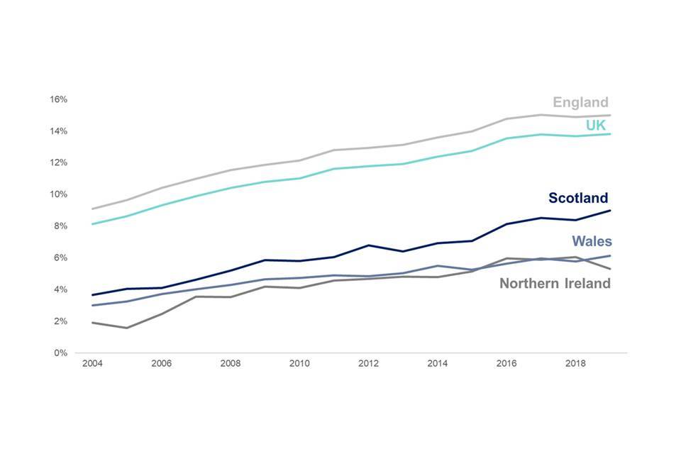 Non-UK domiciled students make up a small share of the total population – no more than 1% with the exceptions of London and Scotland. These proportions have been relatively stable since 2014-15, with noticeable growth only in London, from 1.2% to 1.6%.