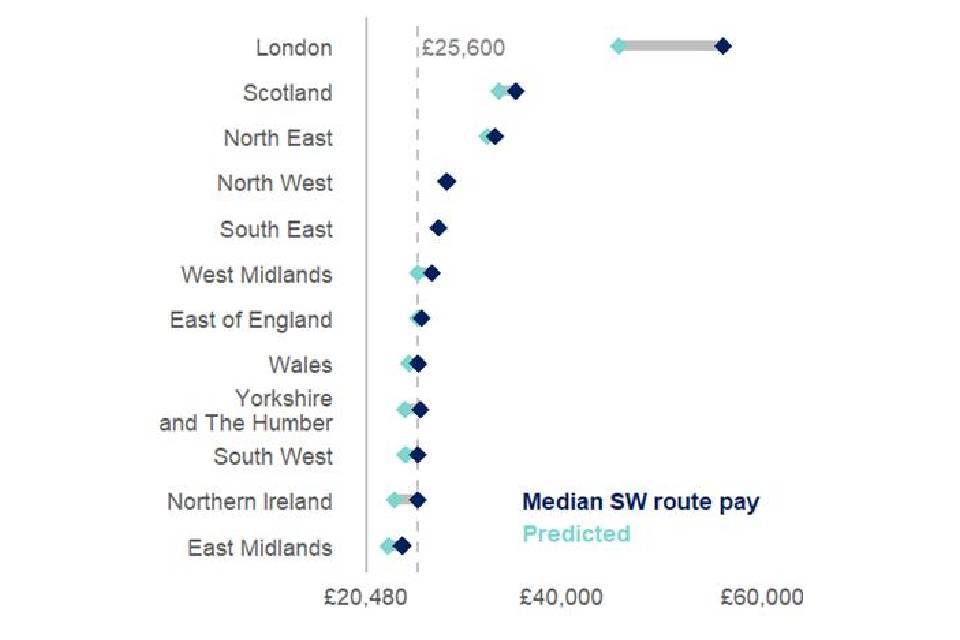 Figure 3.9 shows that outside of London, median pay on the SW route is slightly greater than the labour market prediction, given that SW route pay must sit at a minimum at the 25th percentile of the distribution. In London, median SW route pay is 23% higher than the labour market prediction, suggesting that migrants are paid well above the regional labour market rate.