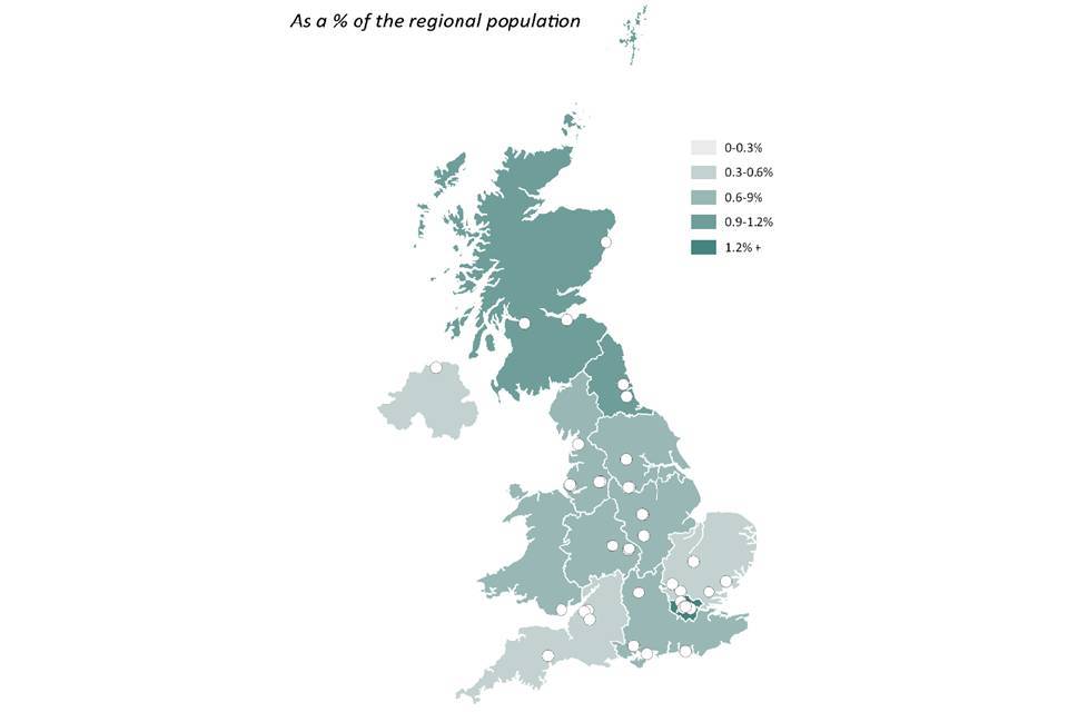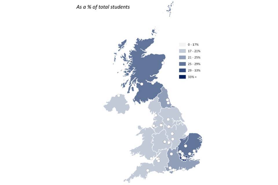 Figure 3.10 sets out the regional distribution of non-UK domiciled students in the 2019-20 academic year, based on data collected by the Higher Education Statistics Authority (HESA). Within a given region, students are likely to be clustered around large universities. These are shown as points on the map.