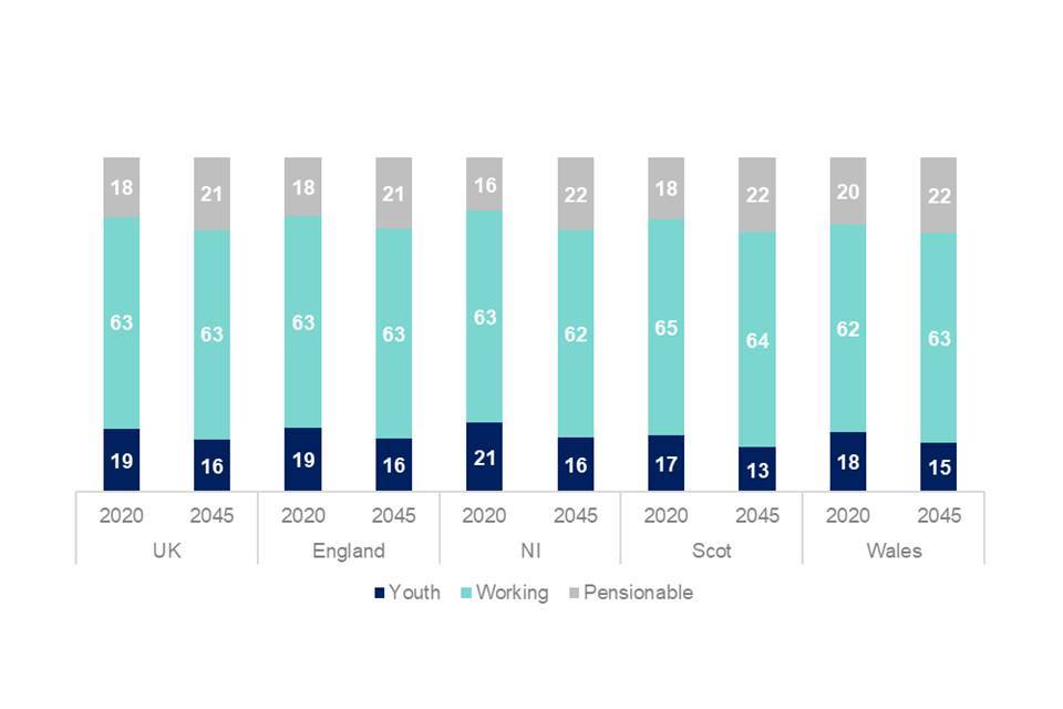 The populations of all constituent nations are projected to continue ageing to mid-2045, with the median age of the UK population increasing from just over 40 to just over 44. As shown in Figure 3.14, this is due to declining proportions of the youth population (0-15) and a growing ‘old age’ or pensionable population (65+). Scotland’s relatively lower dependency ratio could be seen positively from a fiscal perspective, but it is driven by having the lowest proportion of young people (0-15), which balances out its higher ‘old-age dependency ratio’. Wales’s currently higher-than-average dependency ratio is projected to fall to the level of the UK average by 2045 as its pensionable population grows at a slower rate.