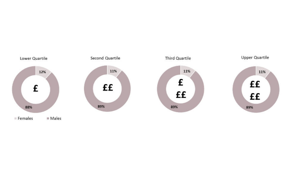 Four separate pie charts for the lower, second, third and upper quartile. The second, third and upper quartiles are the same 89% males and 11% females. Lower quartile figures differ slightly at 88% males and 12% females.