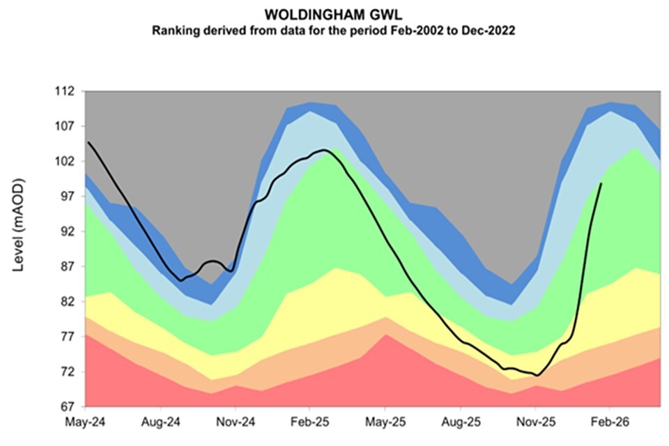 In January 2026, the Chalk aquifer in the South London area started to experience groundwater recharge after receiving 194% of the monthly long-term average rainfall for January. This caused groundwater levels to rise sharply from early January to mid February, and they are expected to continue rising for the rest of the month.