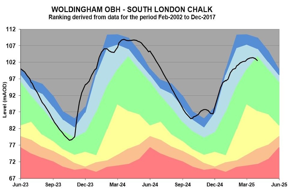 Typically, in the South London area, groundwater levels peak during March. Therefore, we would expect groundwater levels to keep falling until the onset of the next recharge season. Trends of groundwater levels are dependent on the amount and intensity of rainfall we receive in South London until the end of the groundwater recharge season. The recharge season typically comes to an end in the spring.