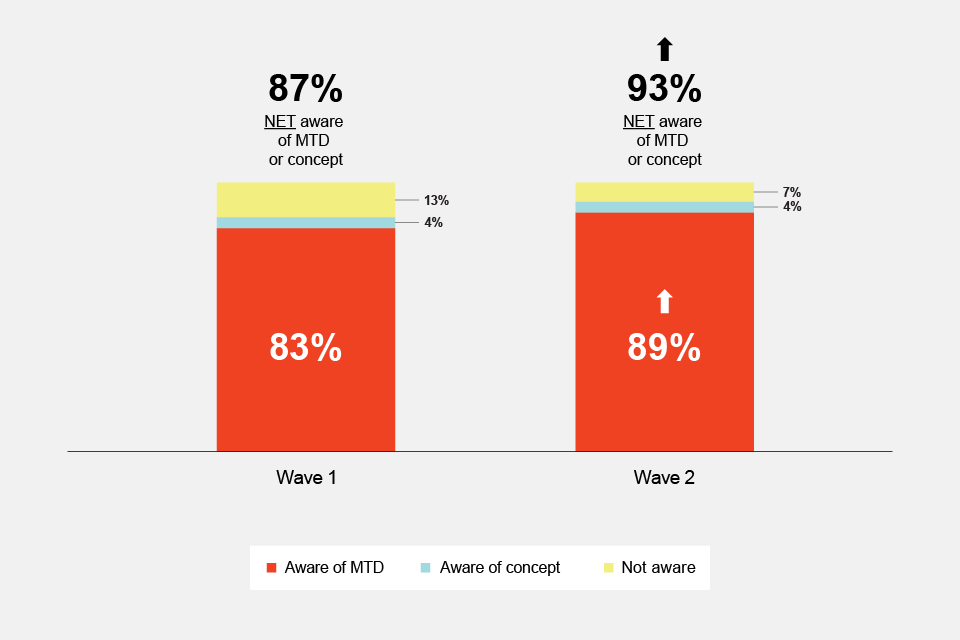 Unprompted awareness of Making Tax Digital, either by the term or concept was high across both waves of research; it was 93% in wave 2, showing a statistically significant increase from 87% in wave 1.