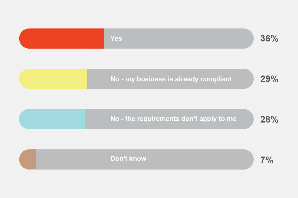 Further to the above, 24% of businesses stated they would not need to do anything, 23% recalled only incorrect requirements and 26% could not recall any specific requirement (correctly or incorrectly).