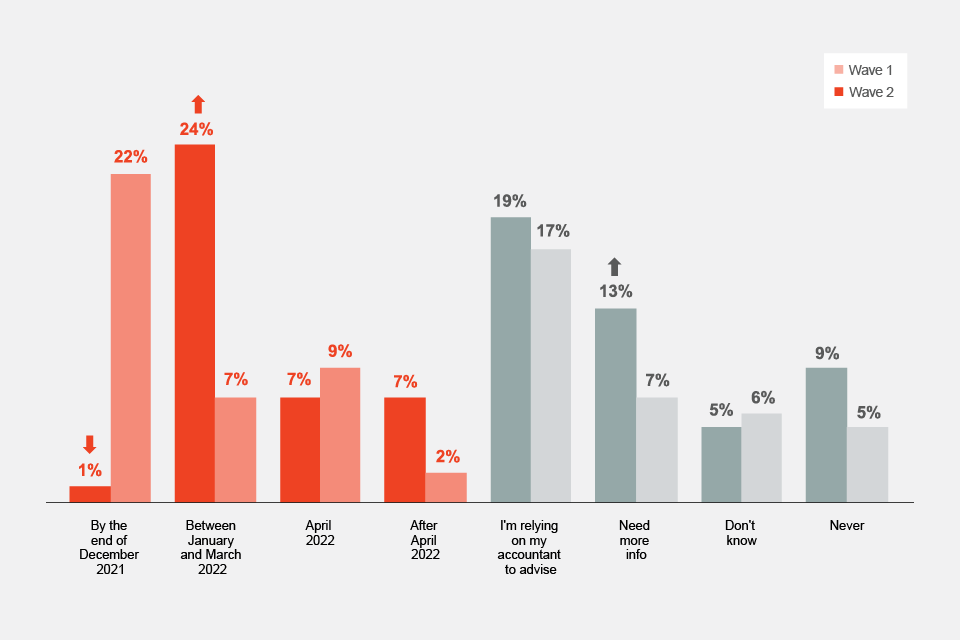 In wave 2, 32% of businesses reported that they planned to take action before or during April 2022. However, 7% said they planned to do so after April 2022. These trends are consistent with wave 1.