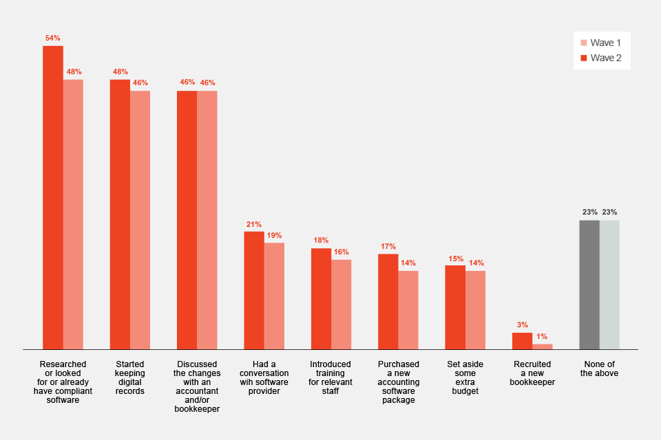 The most common activities in wave 2 were to have researched or looked for compatible software (54%), started keeping digital records (48%), and discussed changes with an accountant (46%). These were consistent with the most common activities completed in wave 1, with 48% having researched or looked for compatible software, 46% having started keeping digital records, and 46% having discussed changes with an accountant.