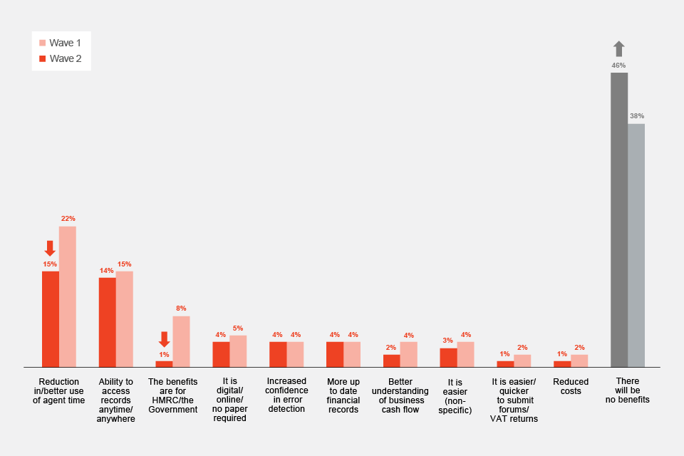 There were few benefits that businesses consistently mentioned. However, a reduction in, or better use of, agent time was perceived to be the greatest benefit to Making Tax Digital (15%), although, this showed a significant decrease since wave 1 (22%). The ability to access records anytime and anywhere was the second most cited benefit at 14% (consistent with wave 1 at 15%). This data provides evidence that these two benefits were important to businesses.