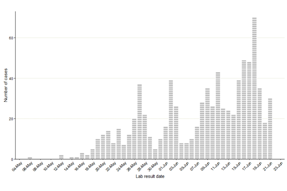 Figure 2. Incidence of confirmed monkeypox cases by laboratory result date in England as of 22 June 2022