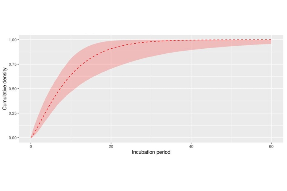 Figure 6. Cumulative density of estimated incubation period. The red dotted line represents the central estimate, and the red swathe represents the 95% credible interval