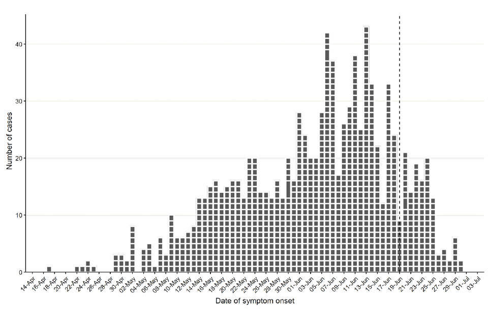 Figure 1. Confirmed monkeypox cases by symptom onset date in England as of 6 July 2022. Dotted line represents reporting delay (between symptom onset and reporting date) of 16 days, based on 90% of cases between 26 June 2022 and 3 July 2022