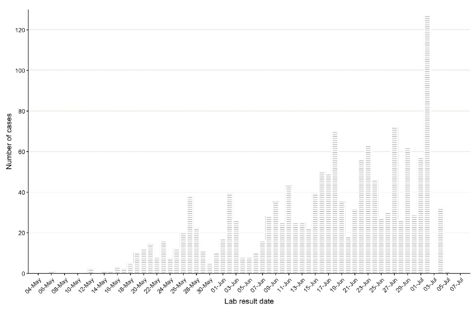 Figure 2. Incidence of confirmed monkeypox cases by laboratory result date in England as of 6 July 2022