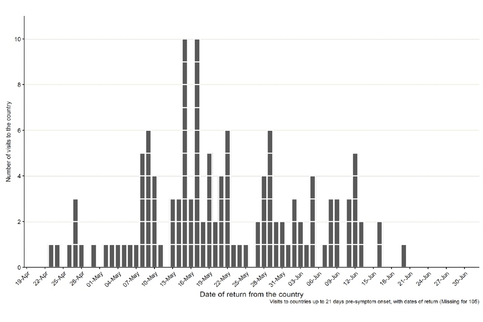 Recent foreign travel, within 21 days prior to symptom onset, was reported by 226 cases in England (16%), with 176 of these reporting travel within Europe (Figure 4).
