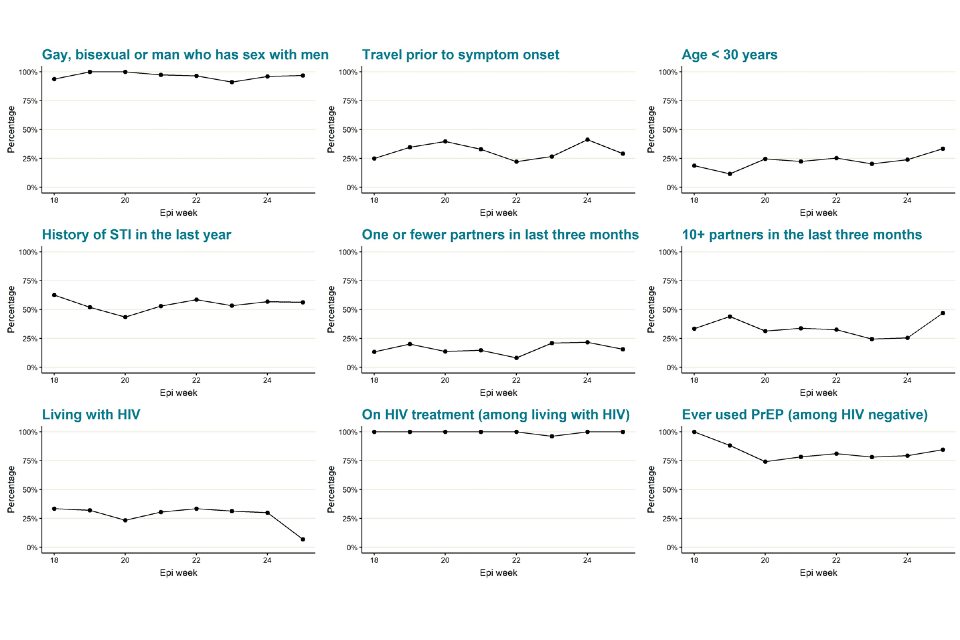 There is considerable data lag. Of cases with information, 97% (681 out of 699) are in gay, bisexual and men who have sex with men (GBMSM). Trends in key epidemiological indicators from case questionnaires are stable, indicating transmission remains within the known high risk GBMSM group, although coverage of questionnaire data is now just 31%.
