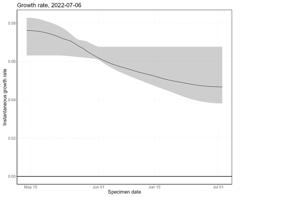 The UKHSA monkeypox nowcasting model implies positive growth between 3.8% to 6.7% per day, corresponding to a doubling time of 15 days (90% CI: 10 days, 18 days). This is consistent with modelling from academic partners, which is not included in this report.