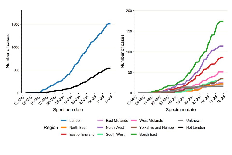 Figure 1. Cumulative monkeypox case count by region of residence in England as of 20 July 2022