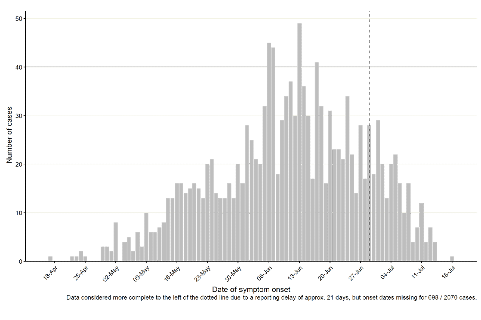 Where specimen date is missing, the date the laboratory received the specimen is used. Where both are missing, date added to the line list is used (32 out of 2,070), mainly among early cases. The data used in this graph can be found in the accompanying spreadsheet.